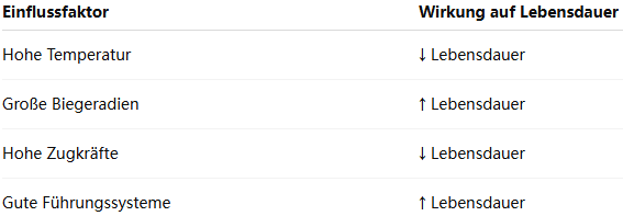 Die Lebensdauer eines Kabels lässt sich näherungsweise durch Wöhlerkurven (S-N-Kurven) beschreiben, die den Zusammenhang zwischen Spannungsamplitude und Bruchzyklen darstellen. Untersuchungen zeigen, dass bereits eine Erhöhung der Biegespannung um 20 % die Lebensdauer um bis zu 50 % reduzieren kann.