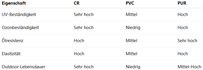 Außeneinsatz unter UV-, Feuchte- und Ozoneinfluss erfolgt.
